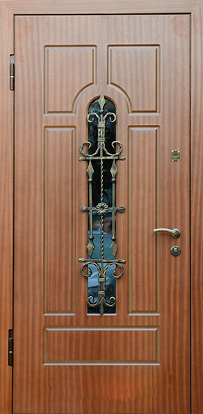 Красивый внешний вид немаловажное, но не самое главное преимущество металлических дверей с элементами ковки. Такие двери еще и очень надежны. Они изготавливаются из холоднокатаной стали толщиной 1,4-2 мм, отделываются массивом, корабельной фанерой, натуральным шпоном или МДФ-панелями, покрытыми виноритом. Установив на нее замки 3 или 4 класса взломостойкости, вы получите дверь, вскрыть которую с помощью грубой силы практически невозможно.