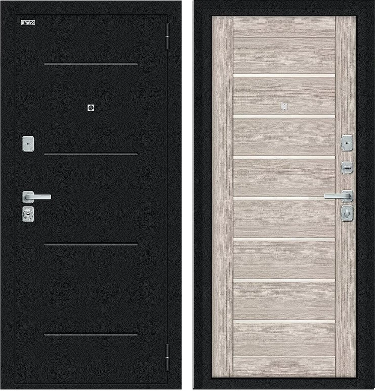 Надежная входная Дверь Браво Техно/BChrome Букле черное/Cappuccino Melinga премиум класса по цене 36 660 руб. Большая толщина стали защитит от проникновения в ваш дом, квартиру или коттедж. Используется очень качественная фурнитура: замки, цилиндры, ручки, защелки. Покрытие и отделка двери изготовлено под внимательным контролем производителя. Дверь имеет долгий срок службы и гарантию.